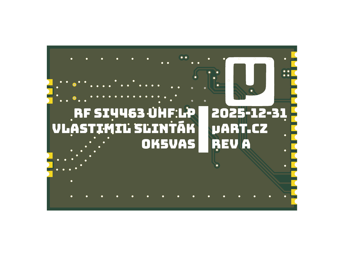 This board is a compact UHF RF module based on the Silicon Labs Si4463 transceiver, designed as a flexible building block for experimental and embedded radio systems.